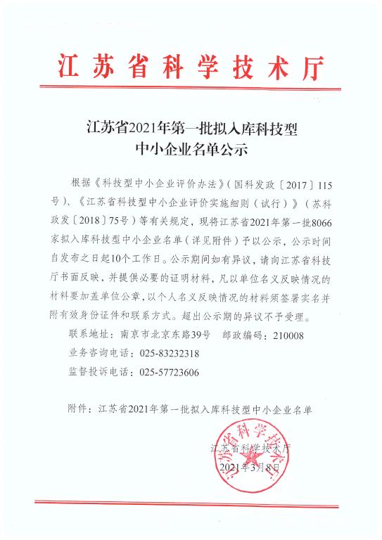 江蘇省2021年第1批擬入庫科技型中小企業名單公示