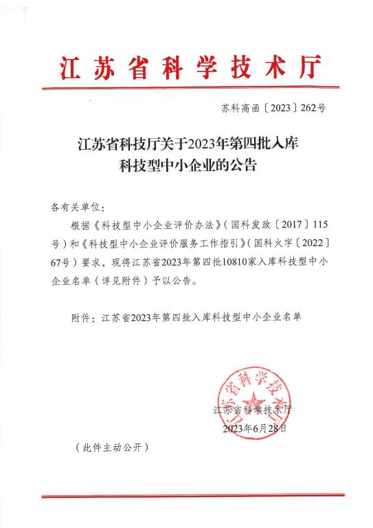 江蘇省2023年第4批入庫科技型中小企業(yè)名單公告