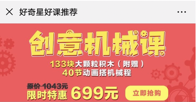 經作者對比,好奇星少兒創客公眾號上顯示,好奇星創意機械課的售價是699元,而盜版售價只要9.8元。