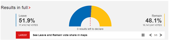 • 據BBC新聞報道,英國當地時間6月24日上午7點,英國脫歐公投所有計票全部結束,最終的結果鎖定在了51.9%支持脫離歐盟,48.1%的票數選擇留在歐盟,雙方陣營之間票數差距達到近130萬。至此,英國脫歐公投塵埃落定,在脫歐和留歐陣營之間反反復復進行了一年有余的拉鋸戰終于敲定。