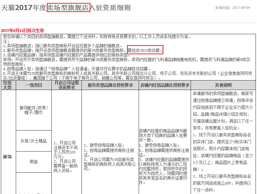 天貓新規:無35類商標,不可開設天貓旗艦店,賣場型需包含3503群組!